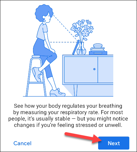 首先,屏幕将说明它将使用您的相机来测量您的呼吸。点击“下一步”继续。