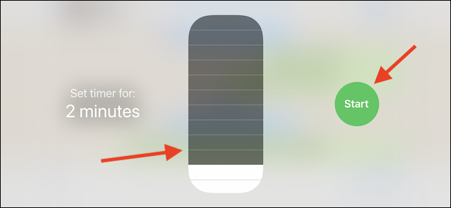 您会看到一个弹出窗口,其中有一个覆盖屏幕的垂直仪表。使用手指,您可以上下滑动以设置计时器间隔。此弹出窗口不允许您设置自定义计时器。您只能选择 1-4 分钟、5 分钟、10 分钟、15 分钟、20 分钟、30 分钟、45 分钟、1 小时或 2 小时的间隔。