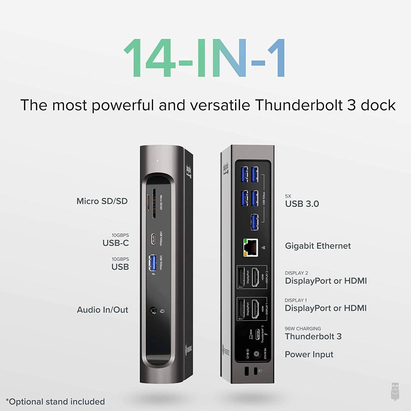 它具有14个端口,其中包括一个微型SD和SD卡读卡器,一个USB-C 10 Gbps端口,一个USB 3.2 A型10Gbps端口,五个USB 3.0 A型端口,一个音频输入/输出端口,一个千兆以太网端口,两个DisplayPort,两个HDMI端口和一个Thunderbolt 3端口,支持96W充电和最高40Gbps的传输速度。