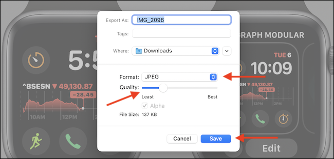 如果无法调整图像大小,但仍想减小文件大小怎么办?预览应用程序也可以为您提供帮助。您可以导出质量较低的 JPEG 格式的图像(此功能不支持PNG 格式,但我们将在下一节中提供解决方案。)。