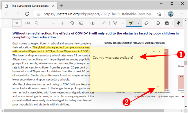 您可以在 Edge 中的 PDF 文件中包含注释或注释以及突出显示的文本以供参考。这可以是评论、关于更改文本的评论或链接。