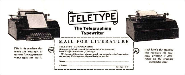 要了解电传打字机背后的基本原理,请想象两台通过电线(或无线电链路)连接在一起的电动打字机。您在一台打字机上输入的任何内容都会自动打印在另一台打字机上。现在想象一下,由于有线网络或无线电传输,这两台打字机可以在任何距离外,你就会明白它们在 20 世纪初期代表了多么大的通信革命。