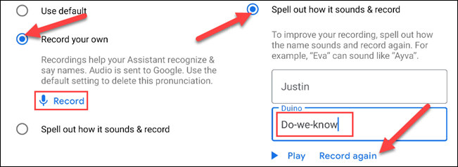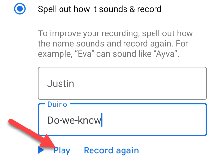 您会看到“姓名发音”部分。您可以点按“播放”来听听谷歌默认是如何说这个名字的。选择“Record Your Own”自己说出来,或选择“Spell Out How it Sounds & Record”以拼音拼出。