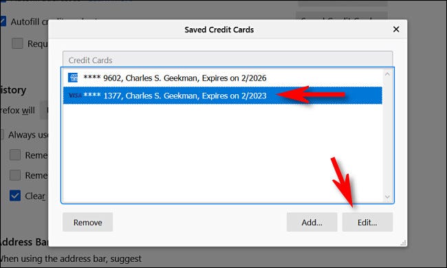 在弹出的窗口中,Firefox 将显示它已保存的所有信用卡的列表。选择您要查看其编号的卡片,然后单击“编辑”。