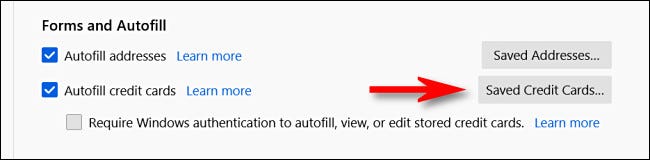 接下来,向下滚动到“表单和自动填充”部分,然后单击“保存的信用卡”按钮。