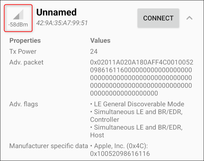 AirTag 将显示为“未命名”设备。如果您点击它,您会看到“制造商特定数据”字段表明此特定条目是 Apple 设备,这暗示此特定设备可能是 AirTag。当然,它也可能是 Apple 制造的另一件硬件。