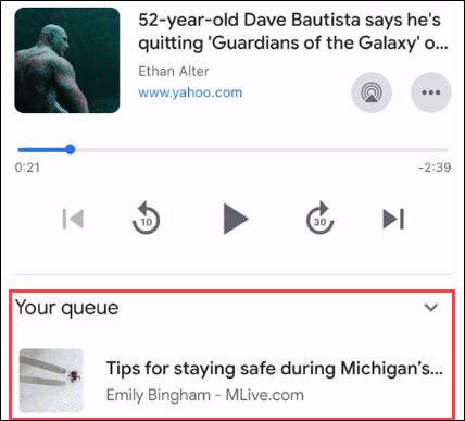 如果您从弹出窗口中选择“添加到队列”,文章将被添加到列表中。类似于播客播放器,文章将按顺序朗读。