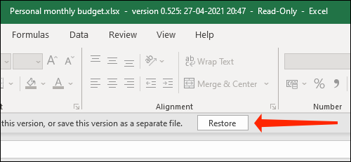 这将打开一个只读工作簿,您可以通过它来检查它是否是正确的版本。如果是,请单击“恢复”。