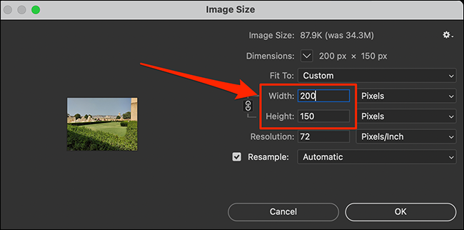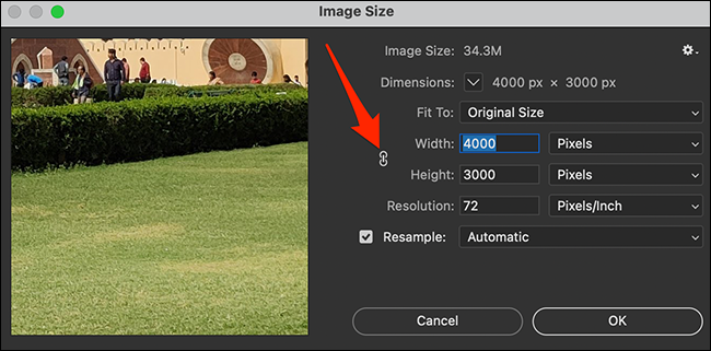 一般来说,你应该保持纵横比,这样你的照片就不会看起来很奇怪。但是如果要禁用它,请单击“宽度”和“高度”之间的链状图标,这样指向“宽度”和“高度”的小线就会消失。