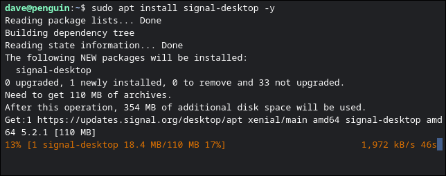 您会看到屏幕上出现大量文本,并在底行看到一个百分比计数器。安装过程完成后,您可以启动 Signal。