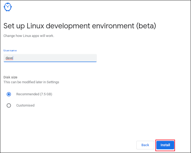 输入用户名,并将磁盘大小选项保留为默认设置。单击“安装”按钮开始安装过程。这将需要几分钟。设置完成后,您将看到 Linux 终端窗口和一个带有闪烁光标的命令提示符。