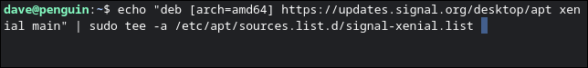 echo "deb [arch=amd64] https://updates.signal.org/desktop/apt xenial main" | 须藤三通 -a /etc/apt/sources.list.d/signal-xenial.list