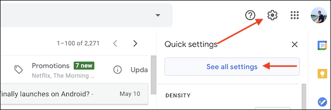 首先,在您喜欢的浏览器中打开Gmail 网站。单击右上角的“设置”图标(看起来像一个齿轮。)并选择“查看所有设置”选项。