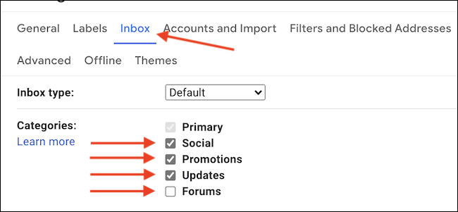 在“设置”中,转到“收件箱”选项卡。在类别部分,取消选中要删除的类别。您可以禁用“社交”、“促销”、“更新”和“论坛”类别。
