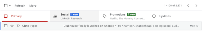 Gmail 现在将重新加载,您会看到标签类别已根据您的选择进行了更新。如果您取消选中所有类别,您的收件箱将在一个视图中显示所有电子邮件,没有任何选项卡(如下面的屏幕截图所示)。