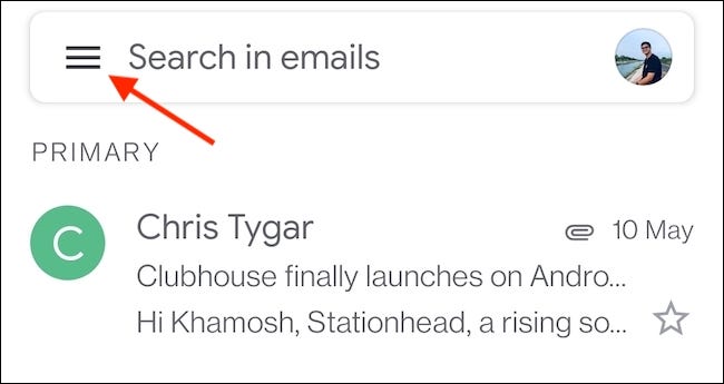 在您的 Android 智能手机上打开 Gmail 应用程序,然后点击屏幕左上角的菜单按钮(三个平行线)。