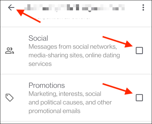 取消选中要隐藏的选项卡类别(例如“更新”、“促销”、“社交”和“论坛”)。如果您使用的是 iPhone,则会看到切换开关。然后,使用左上角的“返回”按钮返回 Gmail 主屏幕。