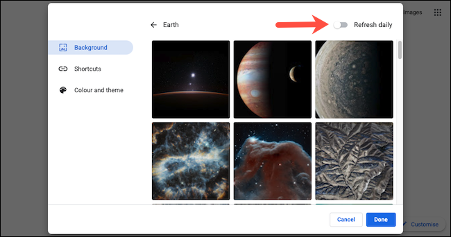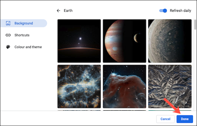 之后,您的 Google Chrome 浏览器上的新标签页将每天显示“地球”收藏(或您选择的任何收藏)的全新背景。