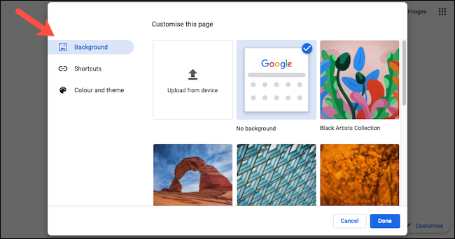 在“背景”页面,您会找到许多预设的背景集合,例如“纹理”、“风景”、“艺术”和“地球”。谷歌浏览器可以每天在新标签页上自动应用这些集合中的任何一个的新壁纸。