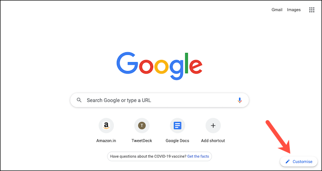 首先,在您的 Windows 10、Mac、Chrome OS 或 Linux 计算机上启动 Google Chrome 浏览器。然后,打开一个新选项卡并单击右下角的“自定义”按钮。
