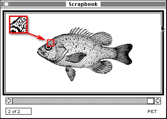 直到 1987 年Macintosh II发布,Mac 平台只支持两种颜色:黑色和白色,中间没有灰色阴影。搭配其相对高分辨率的 512×342 显示屏,营造出独特的图形美感。应用程序开发人员很快就发明了抖动艺术作品以模拟渐变的方法,尤其是在游戏中。