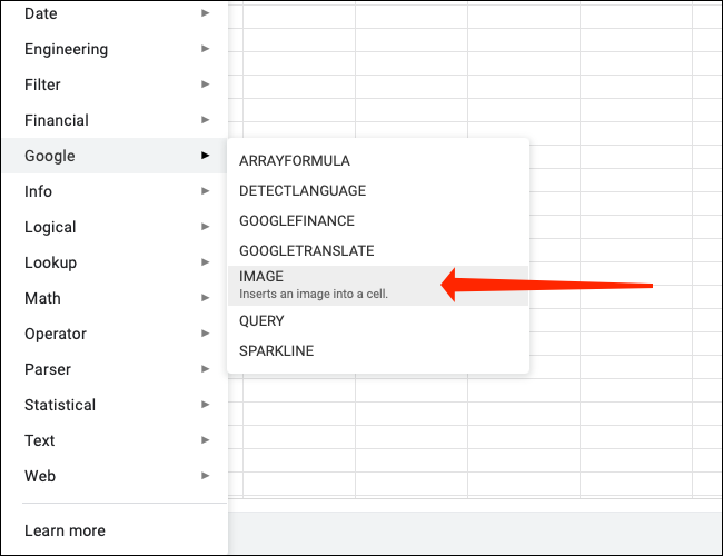 要在 Google 表格的单元格内插入图像,请点击“图像”。