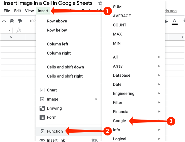 首先,让我们转到https://docs.google.com/spreadsheets/并打开任何电子表格。现在,选择任何单元格并转到电子表格上方的菜单,然后导航到插入 > 函数 > Google。