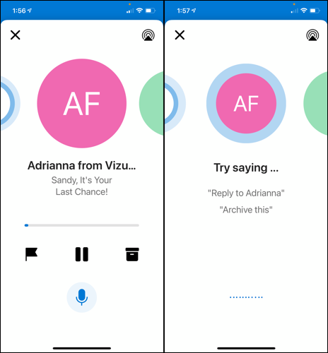 - 点击麦克风图标向 Cortana 发出音频命令。您可以说“跳过”、“删除”、“存档”、“标记为已读”和类似操作。