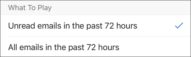 在“玩什么”下方,选择是只收听未读电子邮件还是过去 72 小时内的所有电子邮件。
