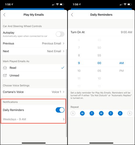 最后,您可以设置每日提醒来收听您的电子邮件。如果您想在每晚睡觉前使用“播放我的电子邮件”,这会很方便。切换“每日提醒”,然后选择一天中的时间。您还可以自定义通知的星期几。点击每天的首字母以突出显示它。