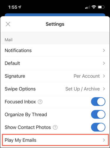 完成自定义“播放我的电子邮件”选项后,点击左上角的后退箭头返回,然后选择“X”按钮关闭菜单并返回收件箱。