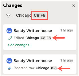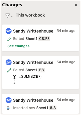 首次打开“显示更改”面板时,您将看到对工作簿所做的所有更改。每次编辑都会列出用户的姓名、时间和/或日期以及更改。