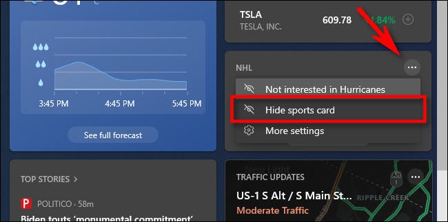在出现的菜单中,选择“隐藏体育卡”(或任何一张卡)。在发布时,无法禁用小部件的新闻提要部分。