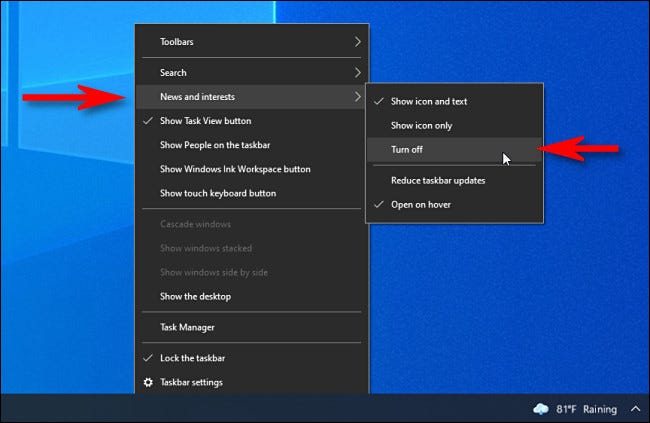 如果您不想在 Windows 10 任务栏上看到新闻小部件,请右键单击任务栏并选择“新闻和兴趣”,然后在出现的菜单中选择“关闭”。
