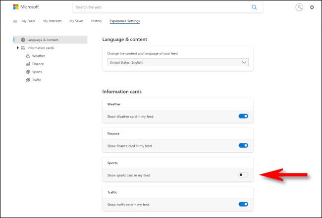 Edge 浏览器将在 MSN.com 网站上打开并加载“体验设置”页面,该页面控制 Windows 10 新闻小部件的首选项。在“信息卡片”部分,将要隐藏的卡片旁边的开关拨到“关闭”。(您也可以从此菜单重新启用隐藏卡。)
