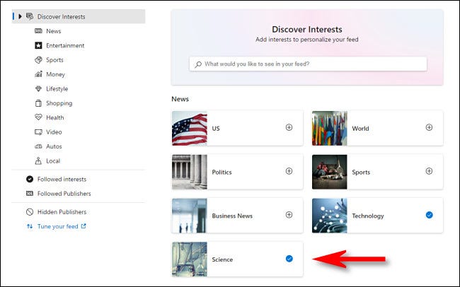 一个特殊的 MSN.com 网页将在您的浏览器中打开,允许您按主题选择或取消选择兴趣。可用的兴趣包括科学、电视、NBA 等。