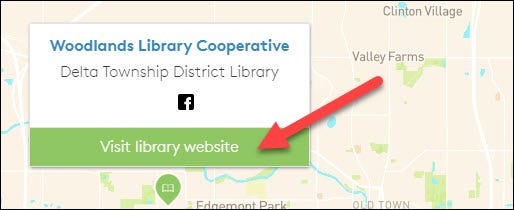使用桌面网络浏览器(例如 Chrome)在OverDrive 搜索地图上找到您的图书馆,然后选择“访问图书馆网站”。