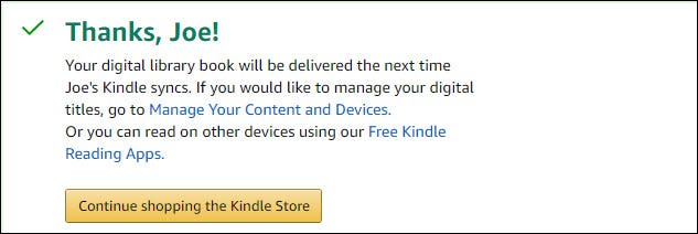 亚马逊将确认您已签出该书,并且在您的 Kindle 设备和应用程序下次执行同步时,该书将出现在您的图书上。