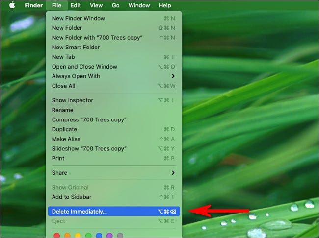 如果您想立即删除文件或文件夹而不将其发送到废纸篓,您有几个选择。在 Finder(或桌面)中,选择该项目,然后按住键盘上的 Option 键并在菜单栏中选择“文件”>“立即删除”。