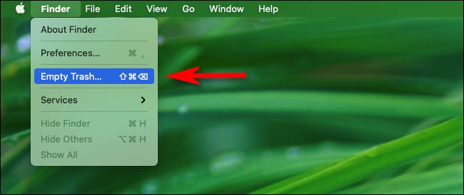 清空废纸篓。” width=”650″ height=”274″ data-mce-src=”https://www.howtogeek.com/wp-content/uploads/2021/06/mac_finder_menubar_empty_trash.jpg?trim=1,1&bg-color=000&pad=1,1″ data-mce-style=”box-sizing: inherit; border: 0px; height: auto; max-width: 650px;”>