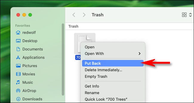 从那里,您可以将项目从垃圾箱窗口拖到桌面(或其他文件夹)上,或者您可以右键单击它们并在菜单中选择“放回”。