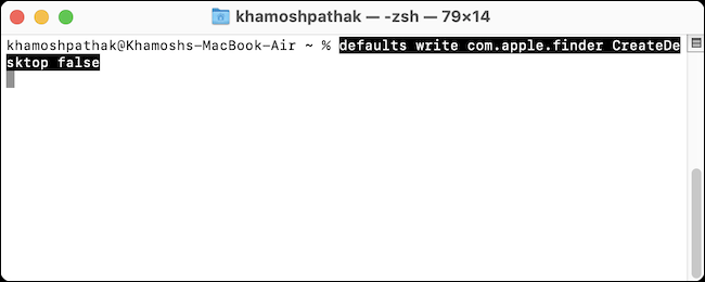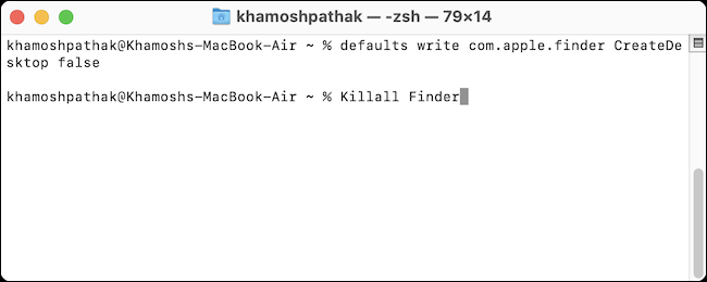 defaults write com.apple.finder CreateDesktop false