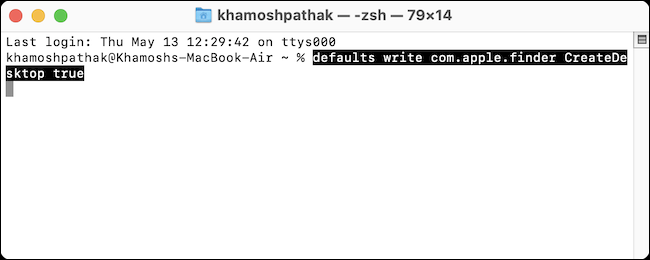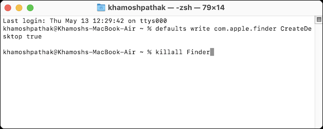 您可以使用另一个终端命令撤销此更改。如果您想要恢复桌面图标,请返回终端应用程序,键入或粘贴以下命令,然后按 Return(或 Enter)。