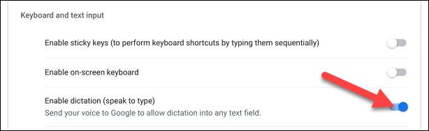向下滚动并打开“启用听写(Speak to Type)”的开关。