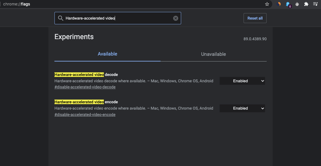 有时,硬件加速会导致 Chrome 浏览器由于 GPU 负载过大而延迟、发热、冻结或崩溃,甚至可能导致笔记本电脑的电池更快耗尽。如果您怀疑硬件加速是罪魁祸首,最好的办法是禁用它,默认情况下该标志是启用的;禁用加速视频解码| 禁用加速视频编码