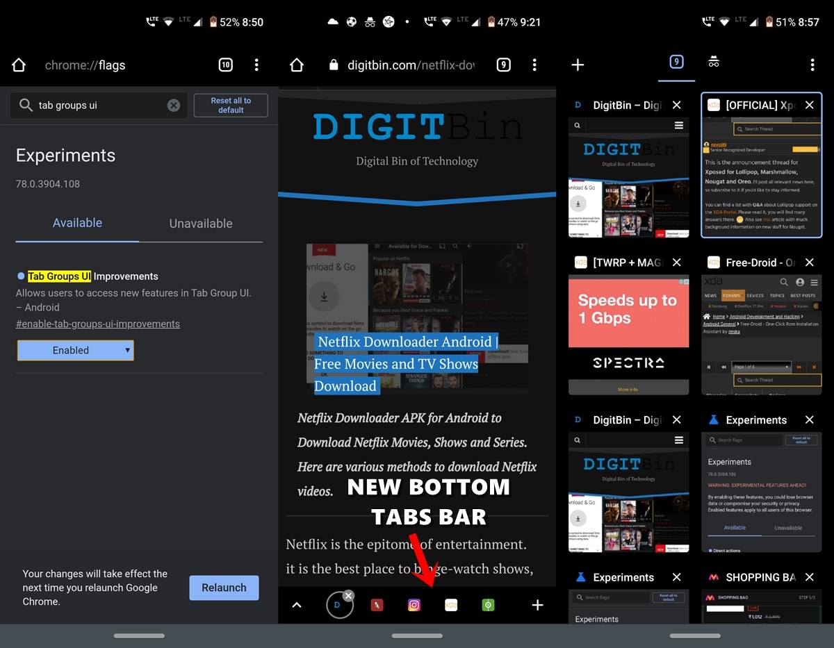 启用它后,您可以创建一个新的底部任务栏,所有打开的选项卡都位于其中。那么已经打开的标签呢?好吧,即使它们也可以被拖到这个新创建的栏上。您所要做的就是点击选项卡切换器。然后,您将看到一个新的选项卡 UI 卡,该卡将分别保存放置在底部任务栏上的所有选项卡。要在其上放置其他选项卡,只需将其他选项卡拖入此卡片即可。此外,您还将获得一个经过改进的新选项卡切换器 UI,如上面的屏幕截图所示。就易用性而言,绝对是一个非常方便的标志。