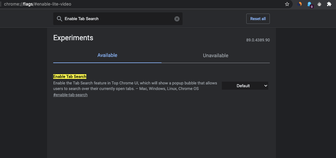 如果您大量使用 Chrome 并在大量标签上工作,那么这个美妙的标志将派上用场。启用该标志,您将在 Chrome 标签栏的顶部看到一个小的搜索栏。在 Top Chrome UI 中启用标签搜索功能,这将显示一个弹出气泡,允许用户搜索他们当前打开的标签。– #enable-tab-search