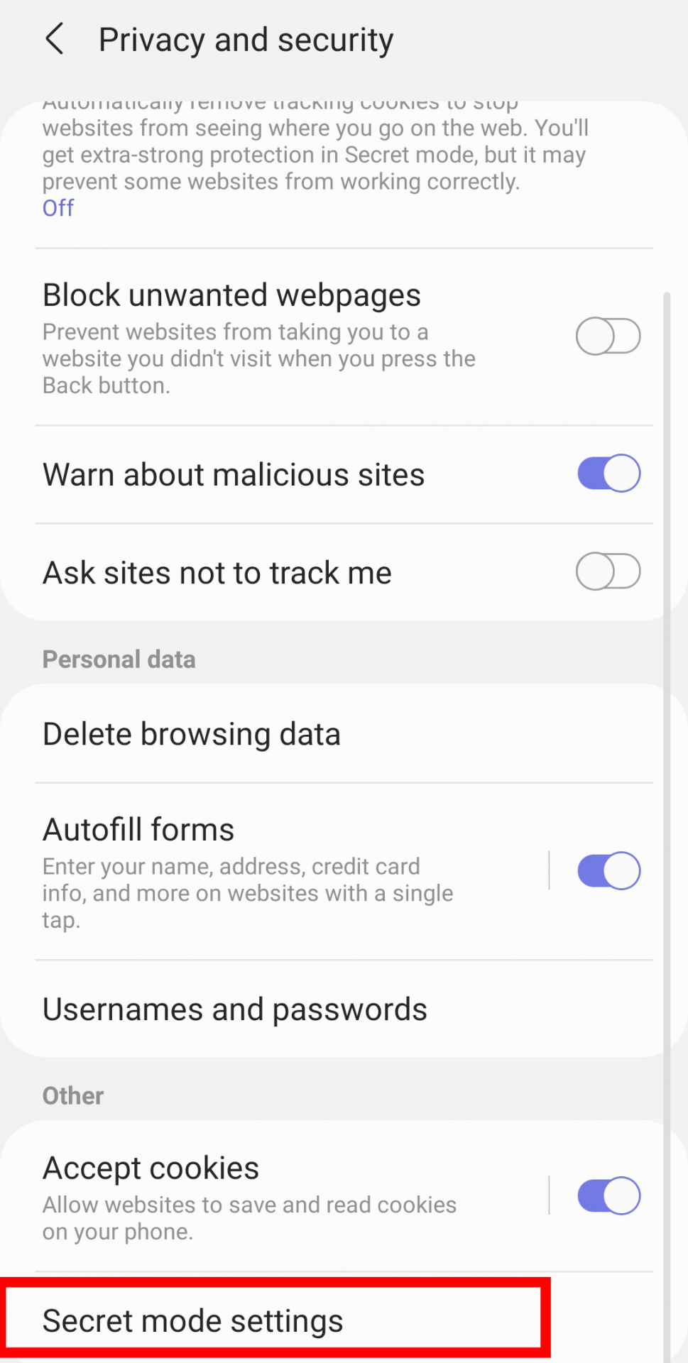- 滚动到底部并选择Secret mode settings。