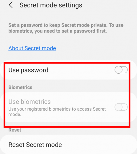 如果您的设备支持指纹等生物识别访问,您还可以打开“使用生物识别” 选项。这将帮助您为在三星 Internet 浏览器上的秘密模式浏览设置密码和生物识别。