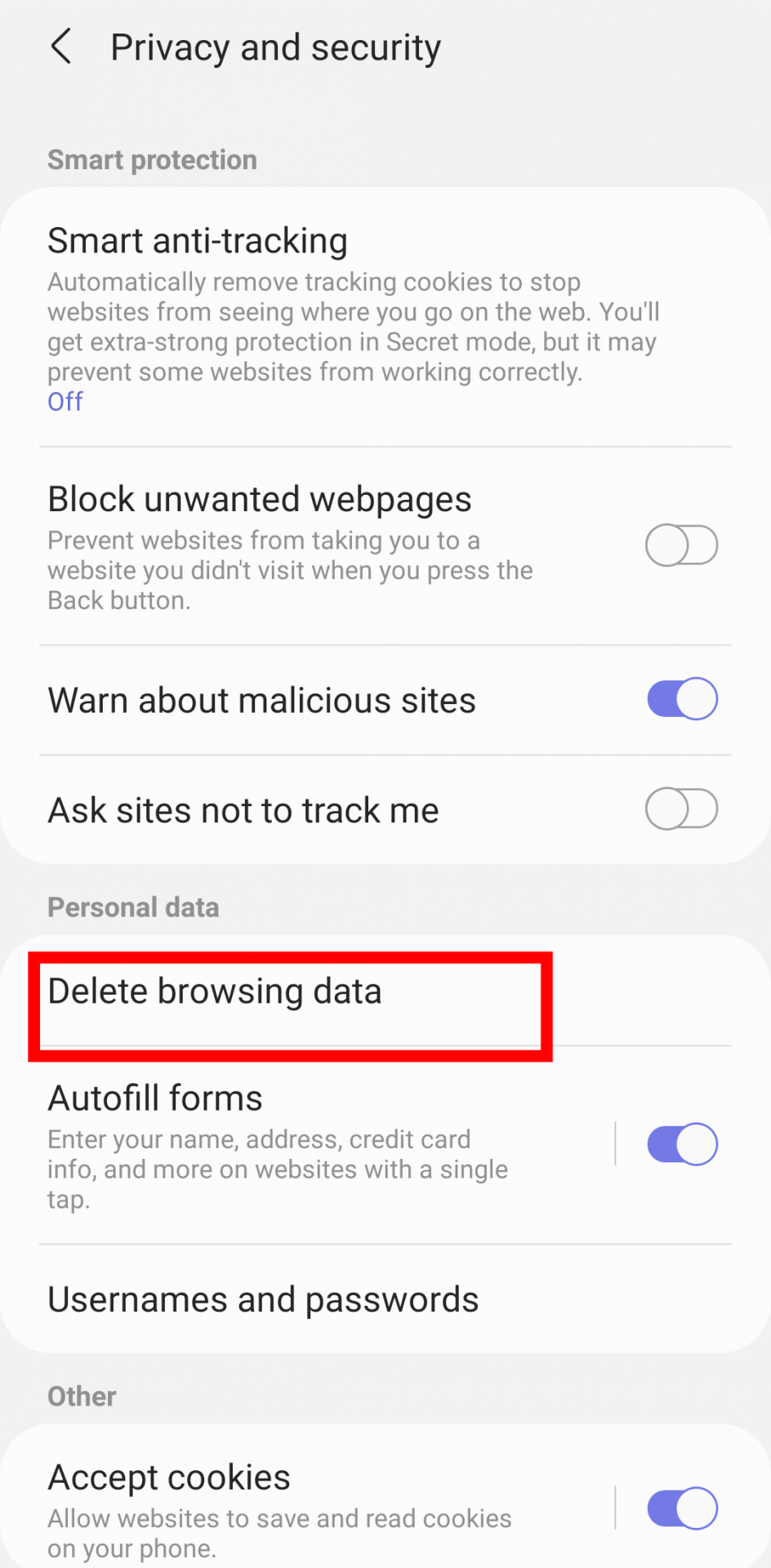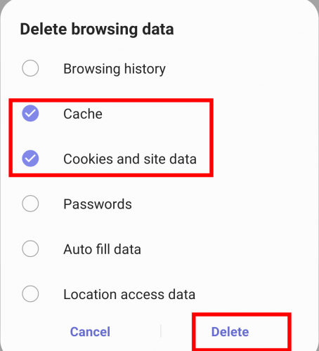 这将立即从浏览器中清除整个浏览缓存和 cookie 数据。这在技术上是三星互联网浏览器的硬刷新。使用这种技术的一个缺点是所有网站的 cookie 和缓存数据都被清除,而不仅仅是一个站点。
